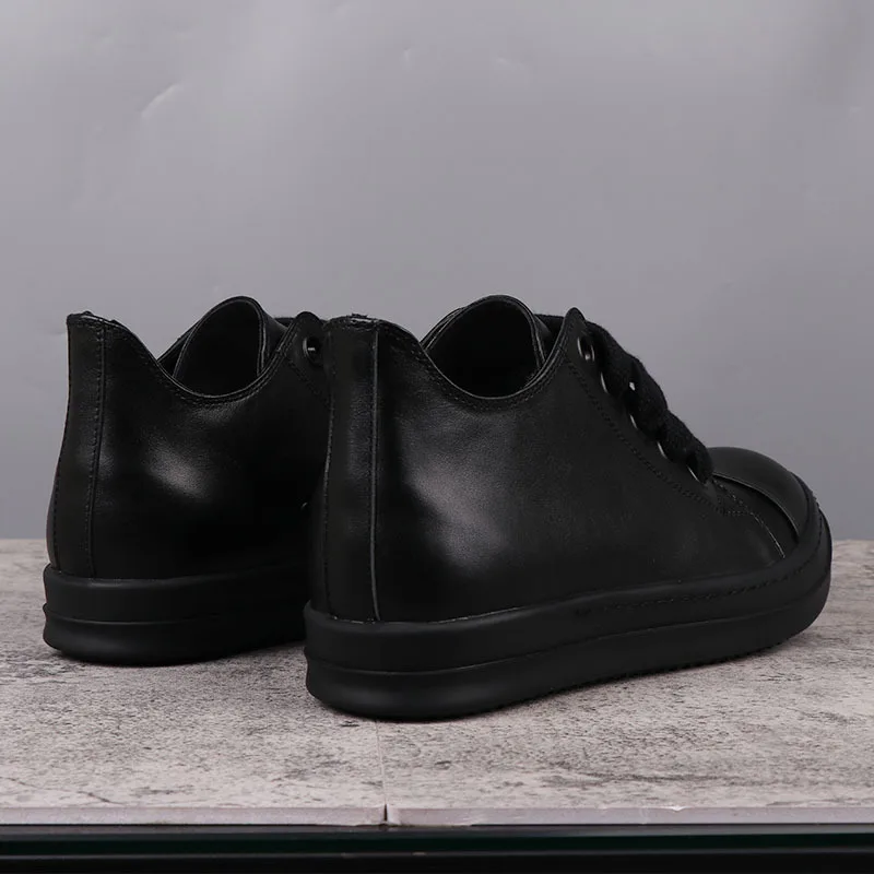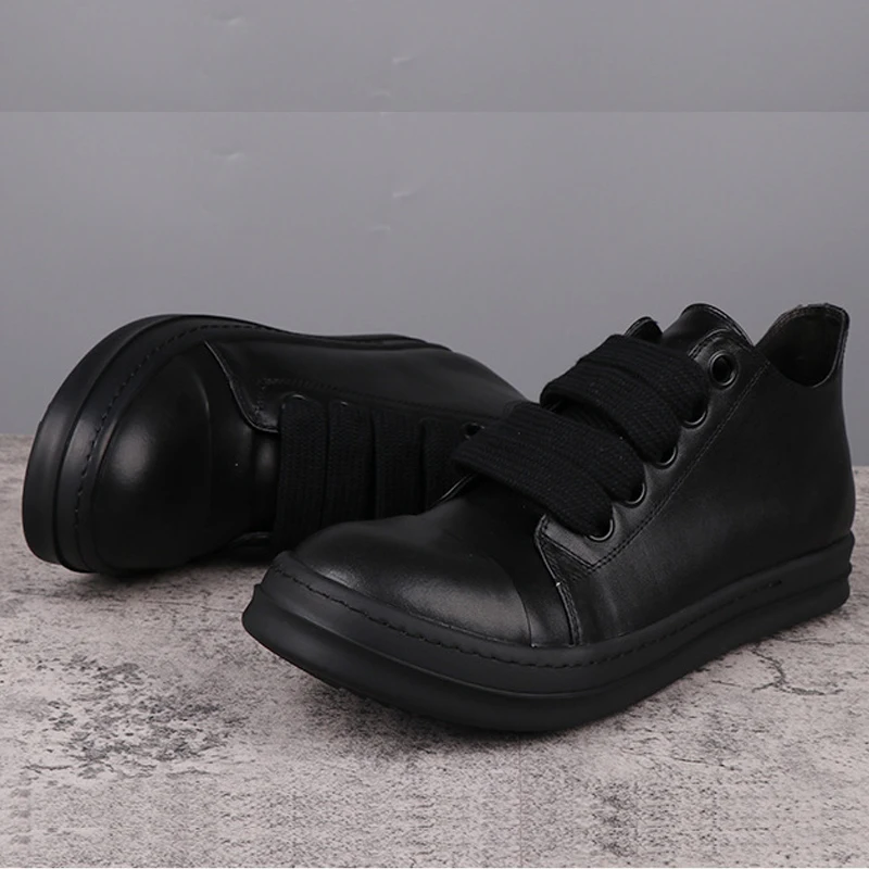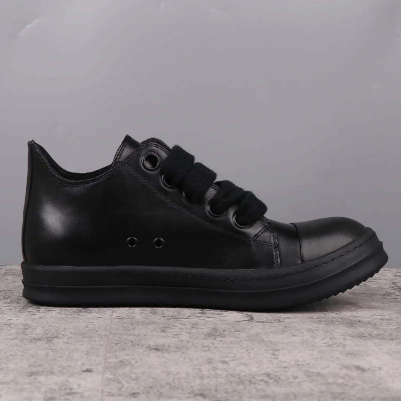 Diese trendigen Unisex Leder-Sneaker in klassischem All Black vereinen urbanen Style mit hohem Tragekomfort. Das minimalistische Design wird durch extra große Schnürsenkel stilvoll aufgewertet – ein echter Blickfang für modebewusste Menschen.